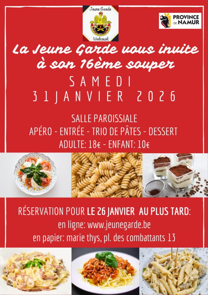 Clôture des réservations le 26 janvier 2026. Les paiements sont à effectuer sur le compte de la Jeune Garde : BE14 1030 8935 7983 pour cette même date. Merci pour votre participation